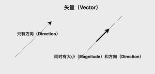 几乎在同一时间,我在物理课上也学习了矢量。老师说速度是一个矢量,因为它既有大小又有方向。但在解题时,我们通常只关心大小。例如,如果一辆车以 60 公里每小时的速度行驶,我们通常不关心方向,只关心它有多快。所以在这种情况下,速度可以被当作标量。但如果我们想知道车往哪个方向开,就需要知道方向,这时速度就是矢量。(速度在英文的定义中更为精准,英文中存在speed和velocity两个单词来描述速度,speed代表标量velocity代表矢量,但在中文中通常只用一个词来表示。)